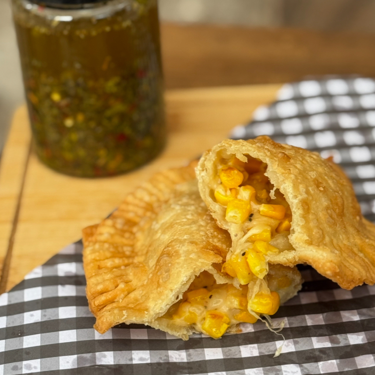 Deliciosa empanada GIGANTE rellena de queso, elote condimentado con pimiento rojo y especias.