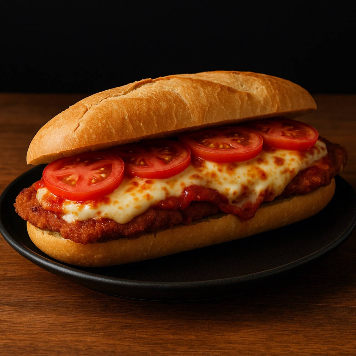 Deliciosa Baguette de Milanesa de pollo con empanizado estilo napolitano con salsa italiana, tomate, queso mozarella y queso parmesano. Acompañado de papas a la francesa!.
