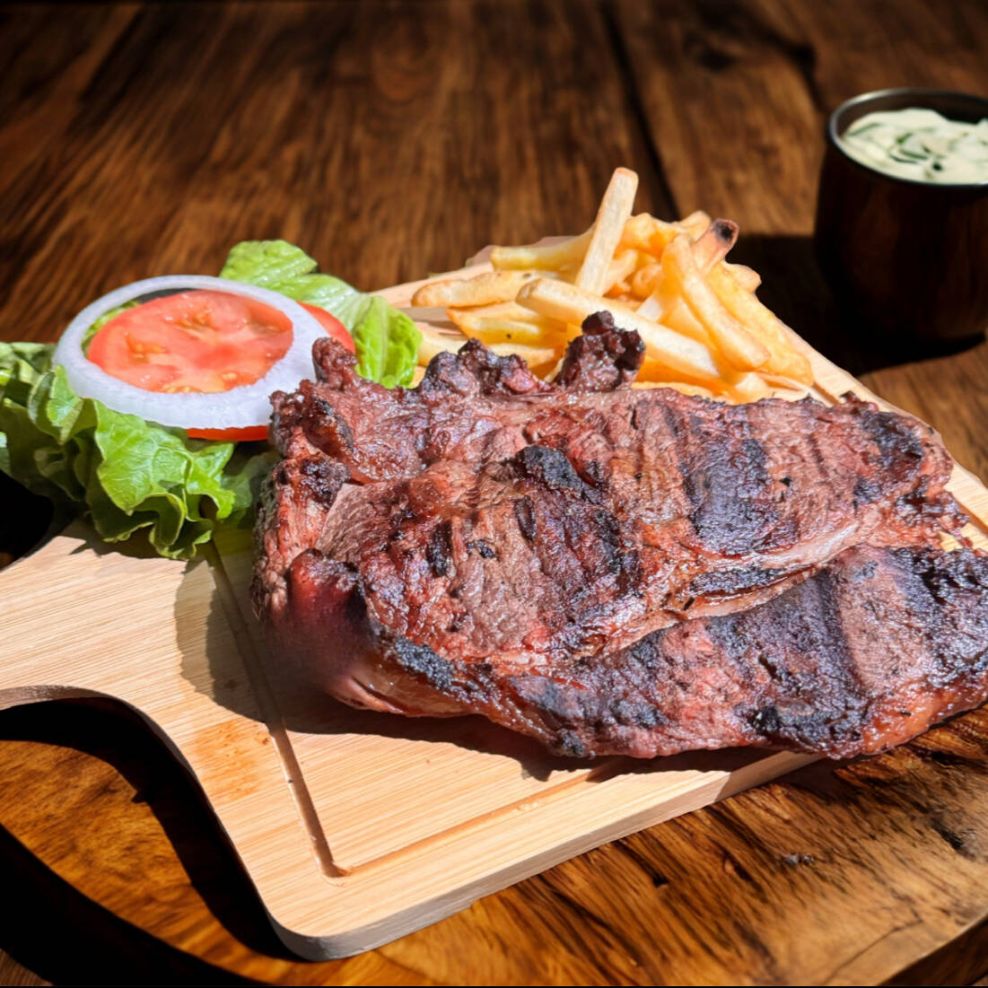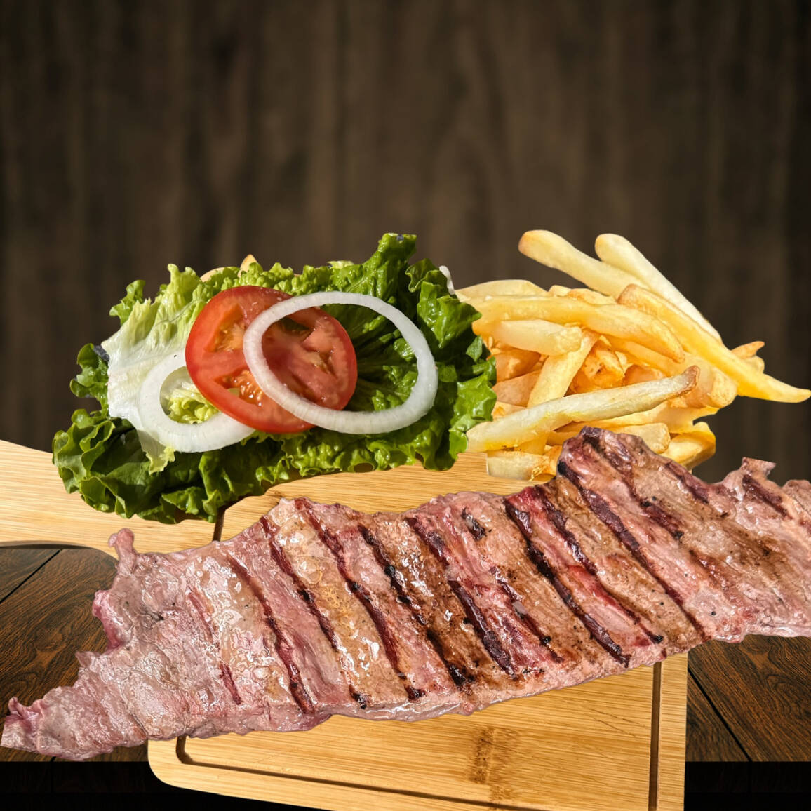 300 grs de Top Sirloin acompañado de ensalada fresca, papas a la francesa y pan con ajo.