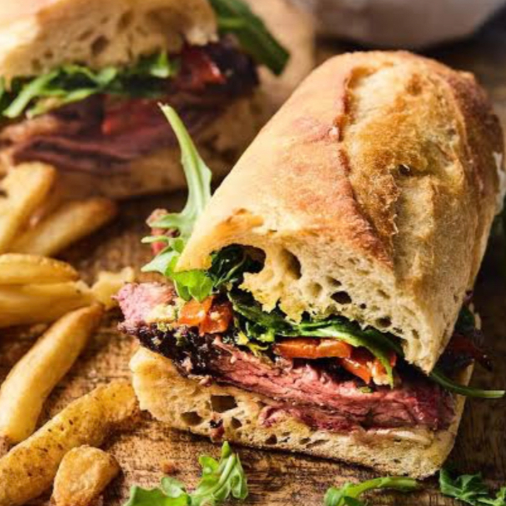 Pan Baguette con toque de aceite de oliva, acompañado de jugosa y suave arrachera, con un aderezo receta de la casa que lleva cama de lechuga, tomate y cebolla. Viene con papas a la francesa!.