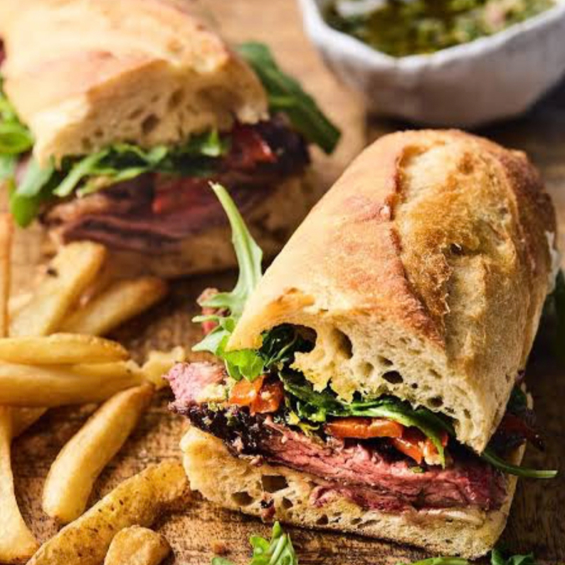 Delicioso Pan Baguette de suave Churrasco con cama de lechuga, tomate, cebolla y aderezo especial de la casa. Incluye papas a la francesa!.