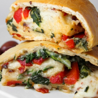 Deliciosa empanada GIGANTE rellena de tomate cherry, Pesto, Queso Mozarella fresco, Albahaca y aceite de oliva.