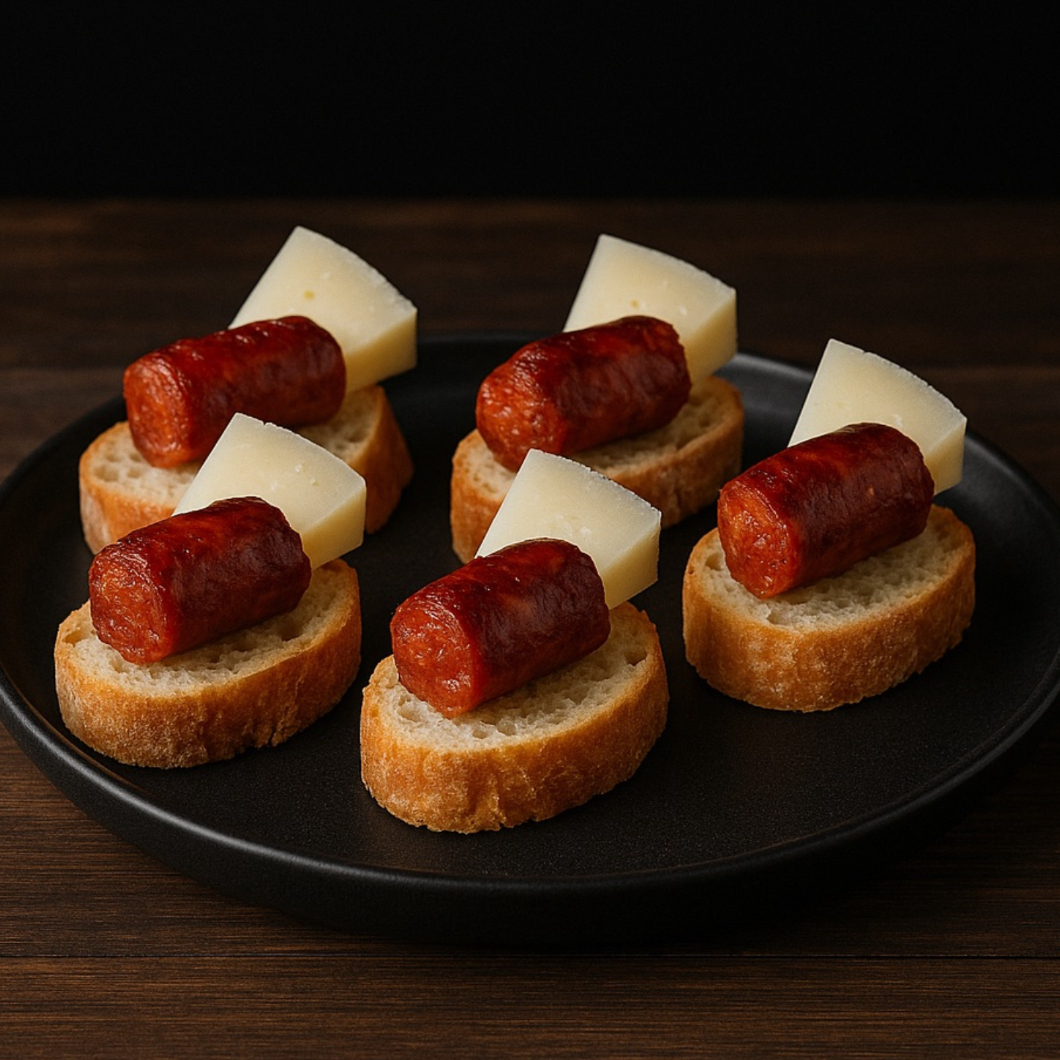 Rebanadas de pan baguette tostado con delicioso aceite de olivo, queso manchego fresco, aceitunas y jugosa chistorra. 5 porciones.