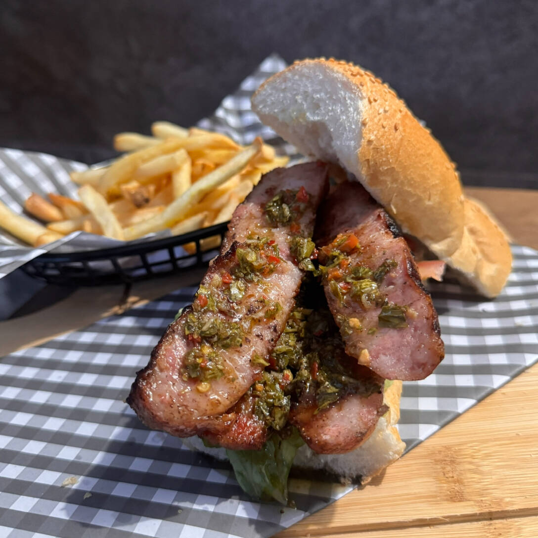 Baguette de un doble jugoso y original chorizo argentino, acompañado de cama de lechuga, tomate y nuestro delicioso chimichurri original argentino.