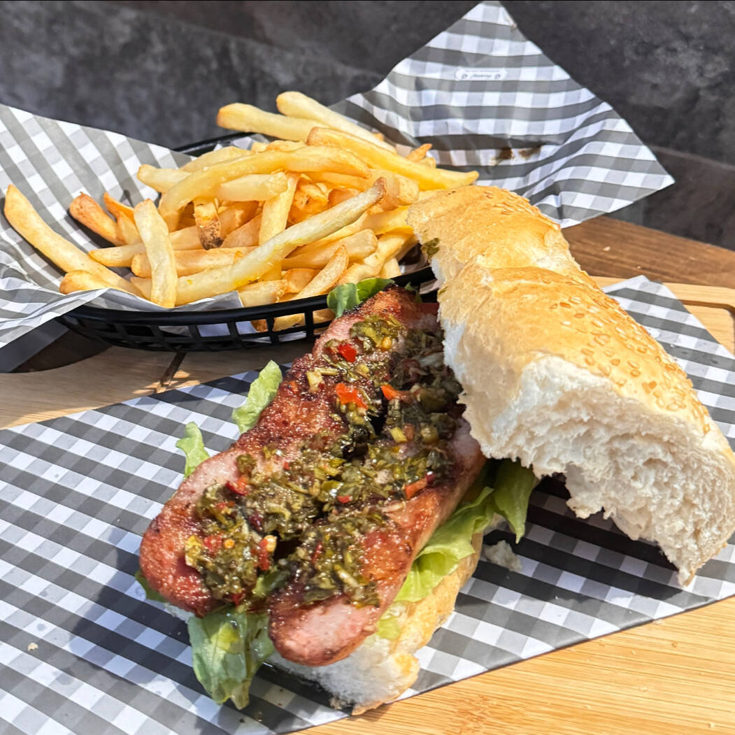 Baguette de jugoso y original chorizo argentino, acompañado de cama de lechuga, tomate y nuestro delicioso chimichurri original argentino.