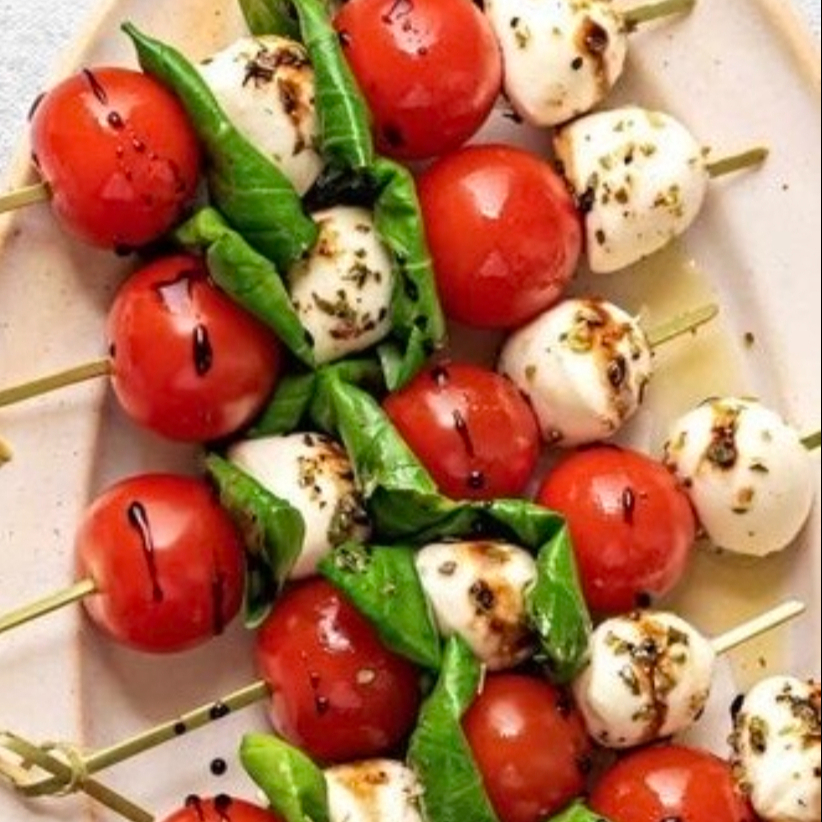 Banderitas de Tomate Cherry fresco, con rodajas de queso mozarella y hojas de albahaca con aceite de oliva, balsamico y especias. 3 piezas.