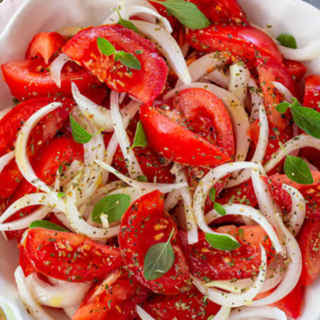 Deliciosas rebanadas de jitomate y cebolla, condimentada con especias, vinagre balsamico y aceite de oliva.