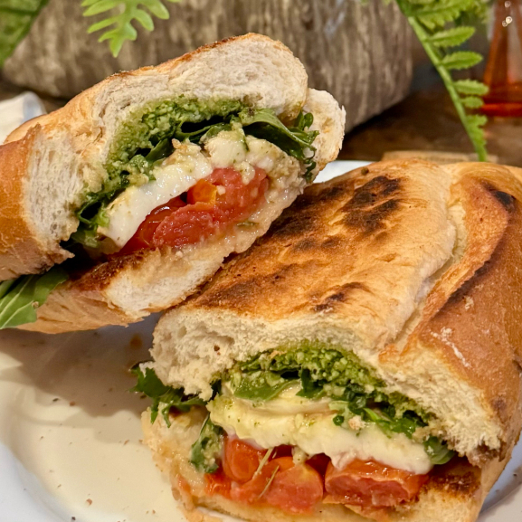Pan Baguette con deliciosa cama de pesto, tomate cherry, queso mozarella y arugula fresca. Incluye papas a la francesa!.