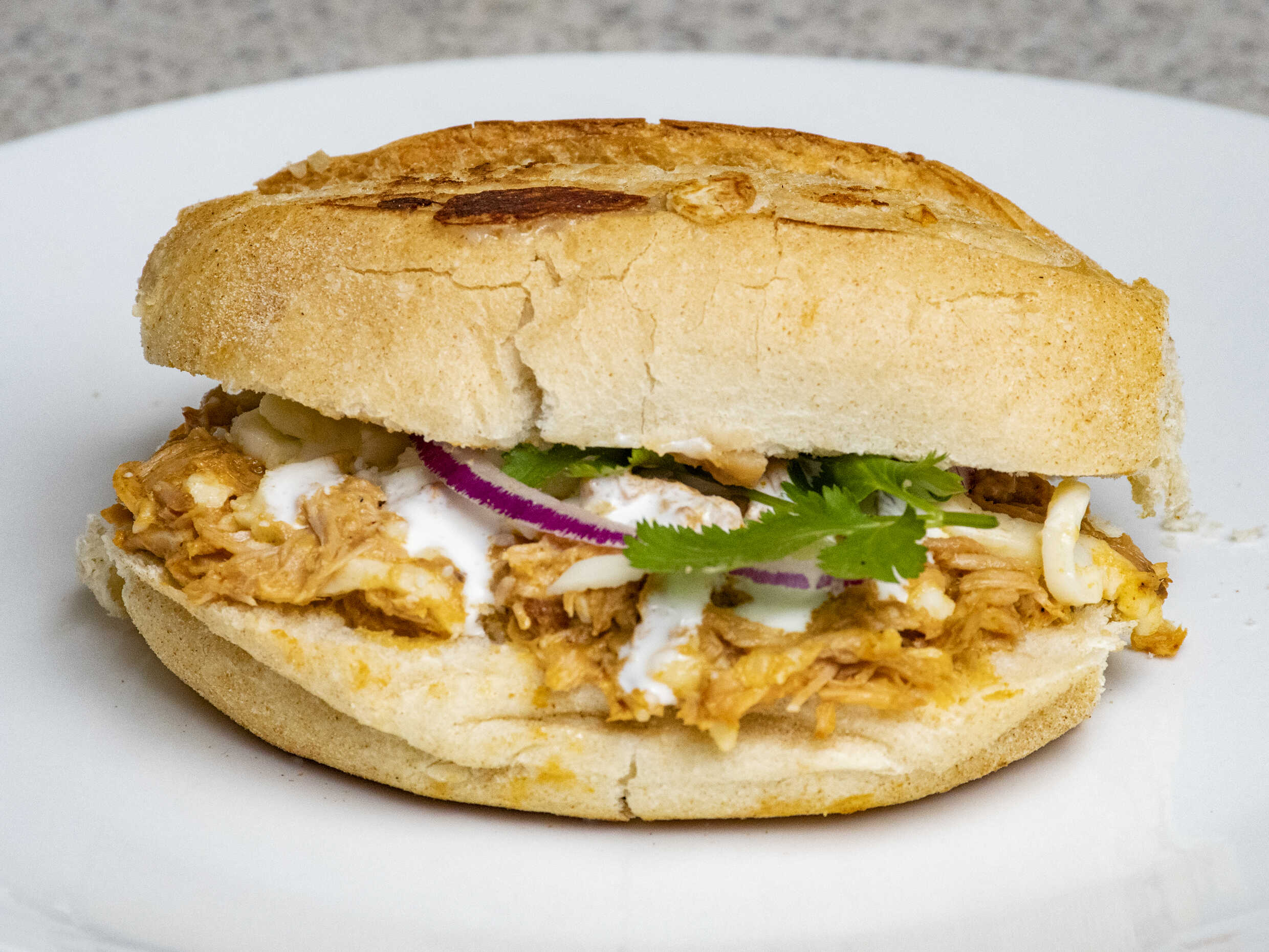 Bolillo relleno de una capa de frijoles, cochinita pibil, queso, crema y a un lado cebollita morada con habanero.