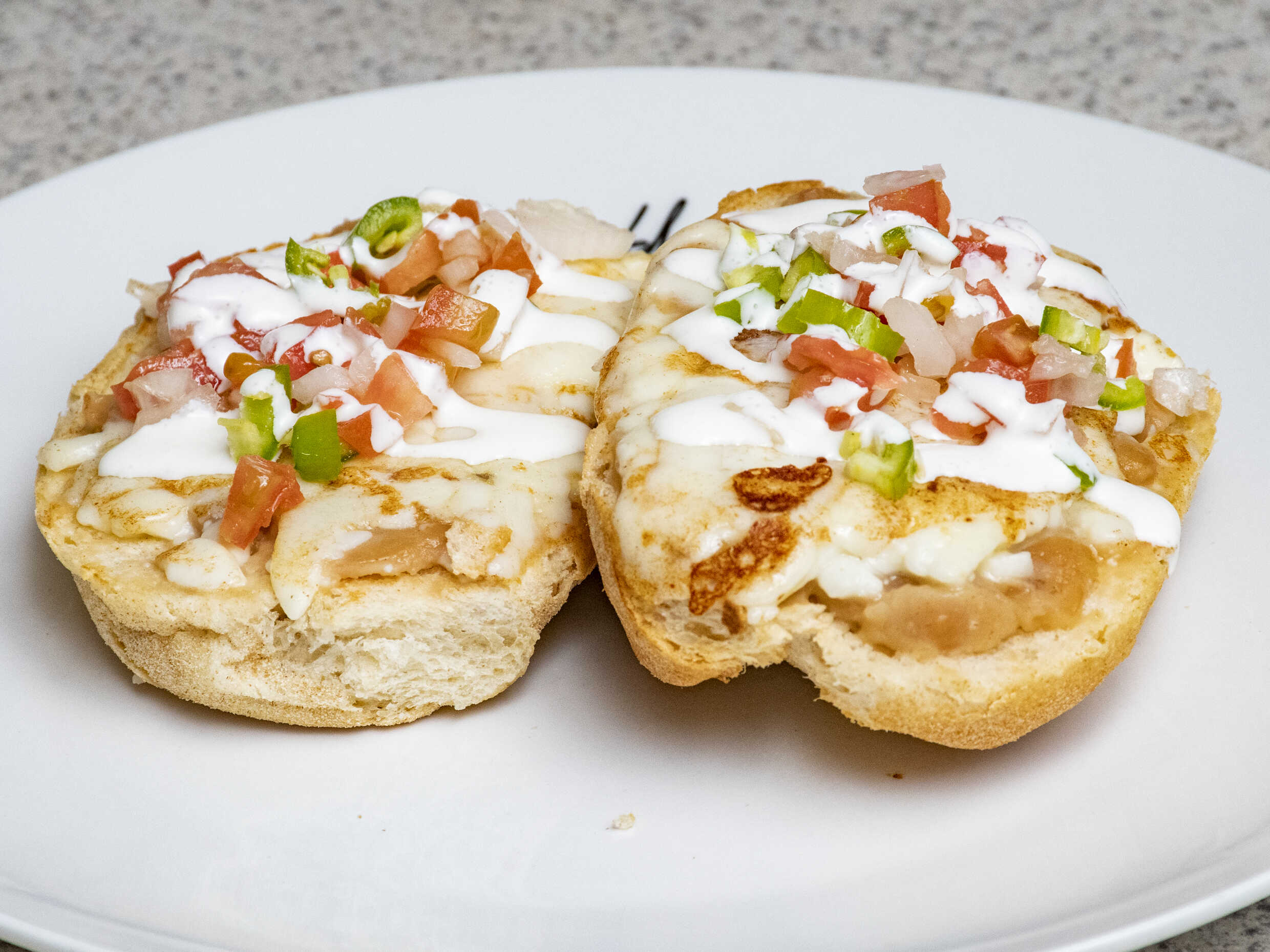 Molletes gratinados con frijoles, queso y pico de gallo.