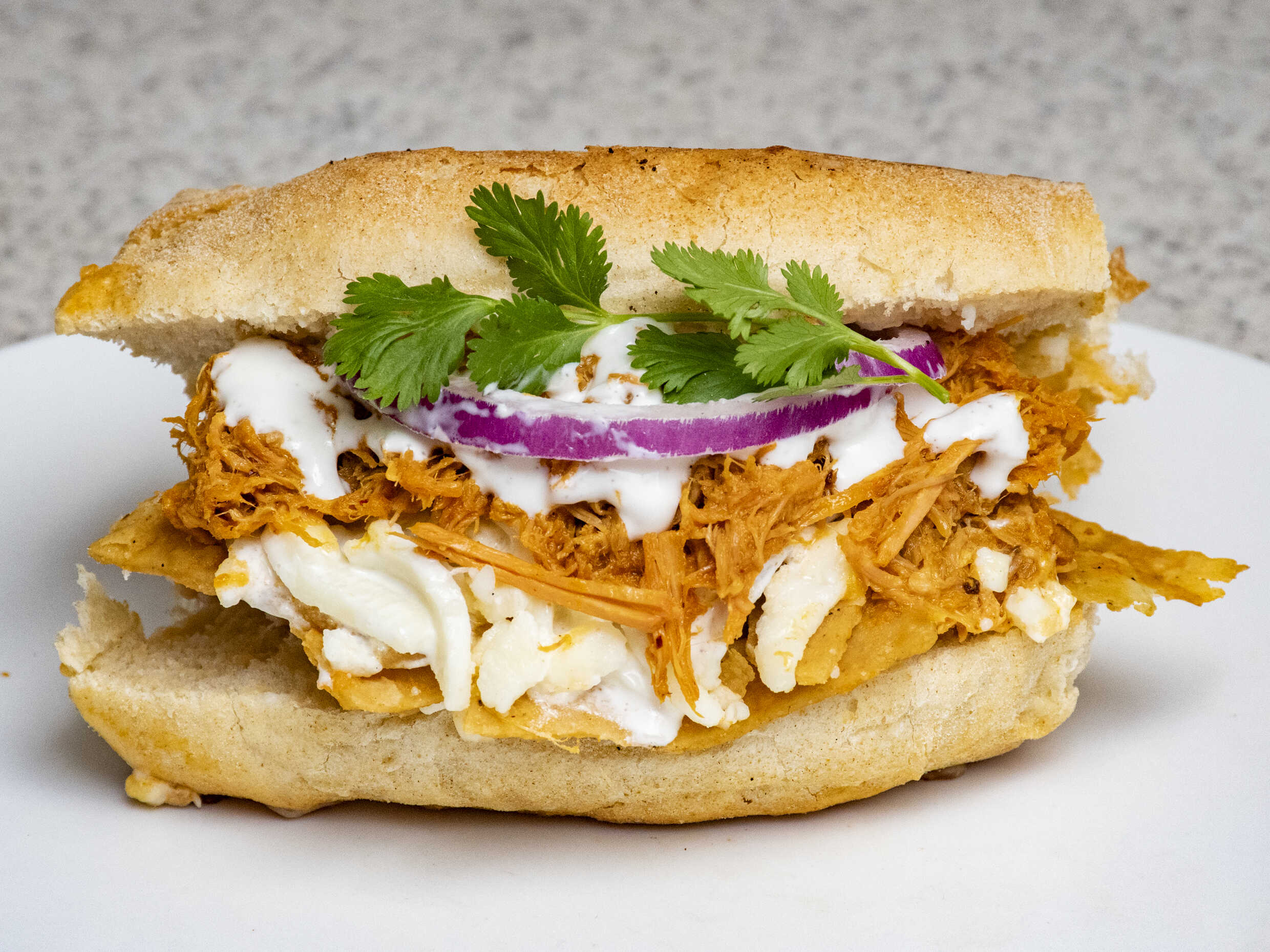 Bolillo relleno de una capa de frijoles con chilaquiles, cochinita pibil, queso, crema y a un lado cebollita morada con habanero.