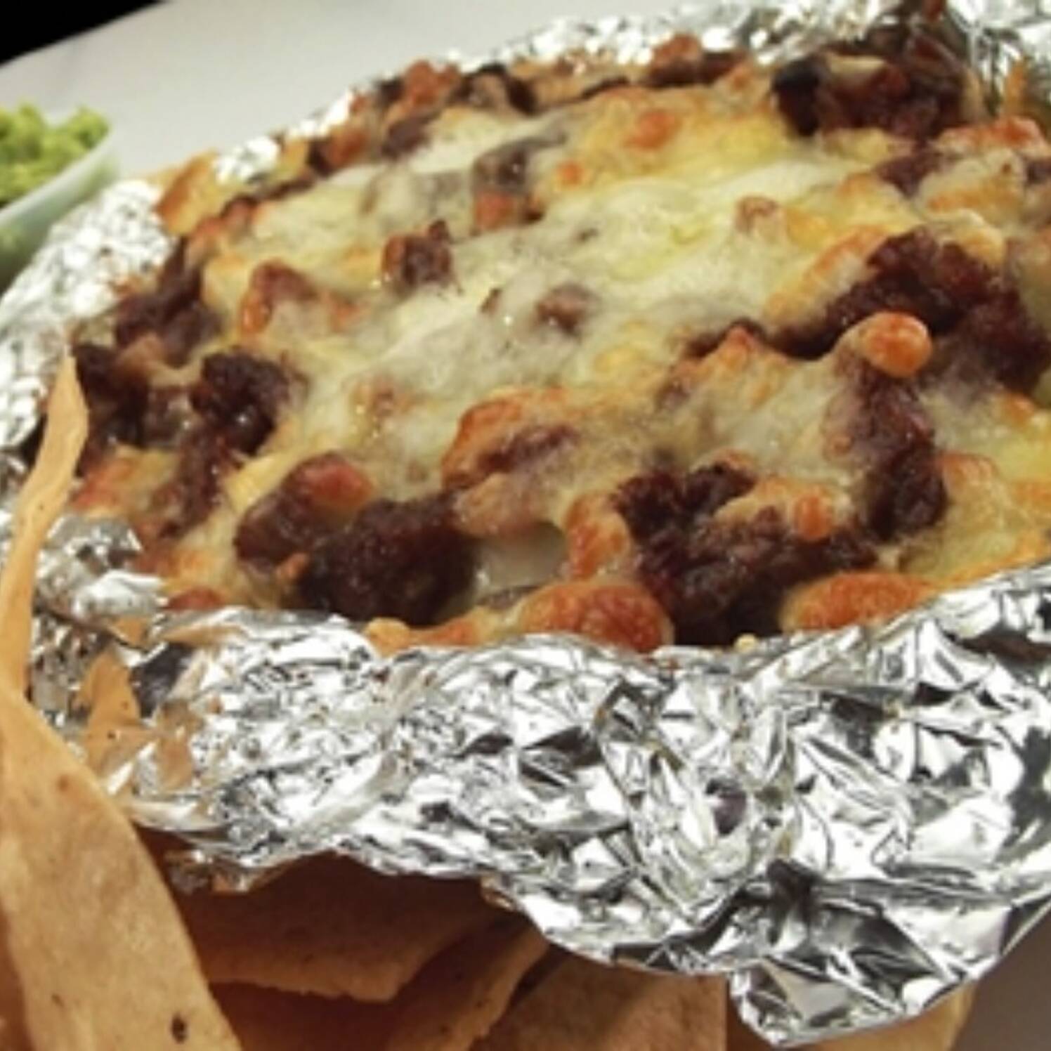 100 Gramos de totopo con Arrachera, acompañado de queso amarillo fundido, frijoles y chiles jalapeños.
