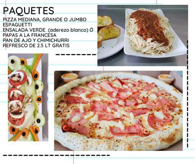 Pizza de 12 rebanadas de pepperoni, tocino y jamón, 1lt de espagueti napolitano, ensalada verde, pan de ajo y aderezo. Acompañada de refresco 2.5lt.