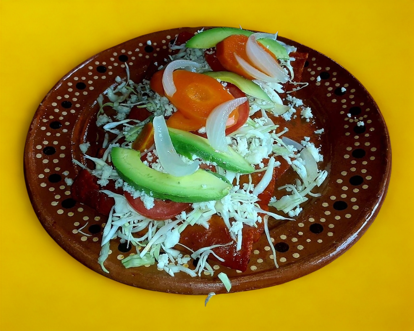 orden de 8 taquitos rojos rellenos de papas y frijol acompañados de una ensalada de repollo y una rica mezcla de cebolla y zanahoria encurtido .