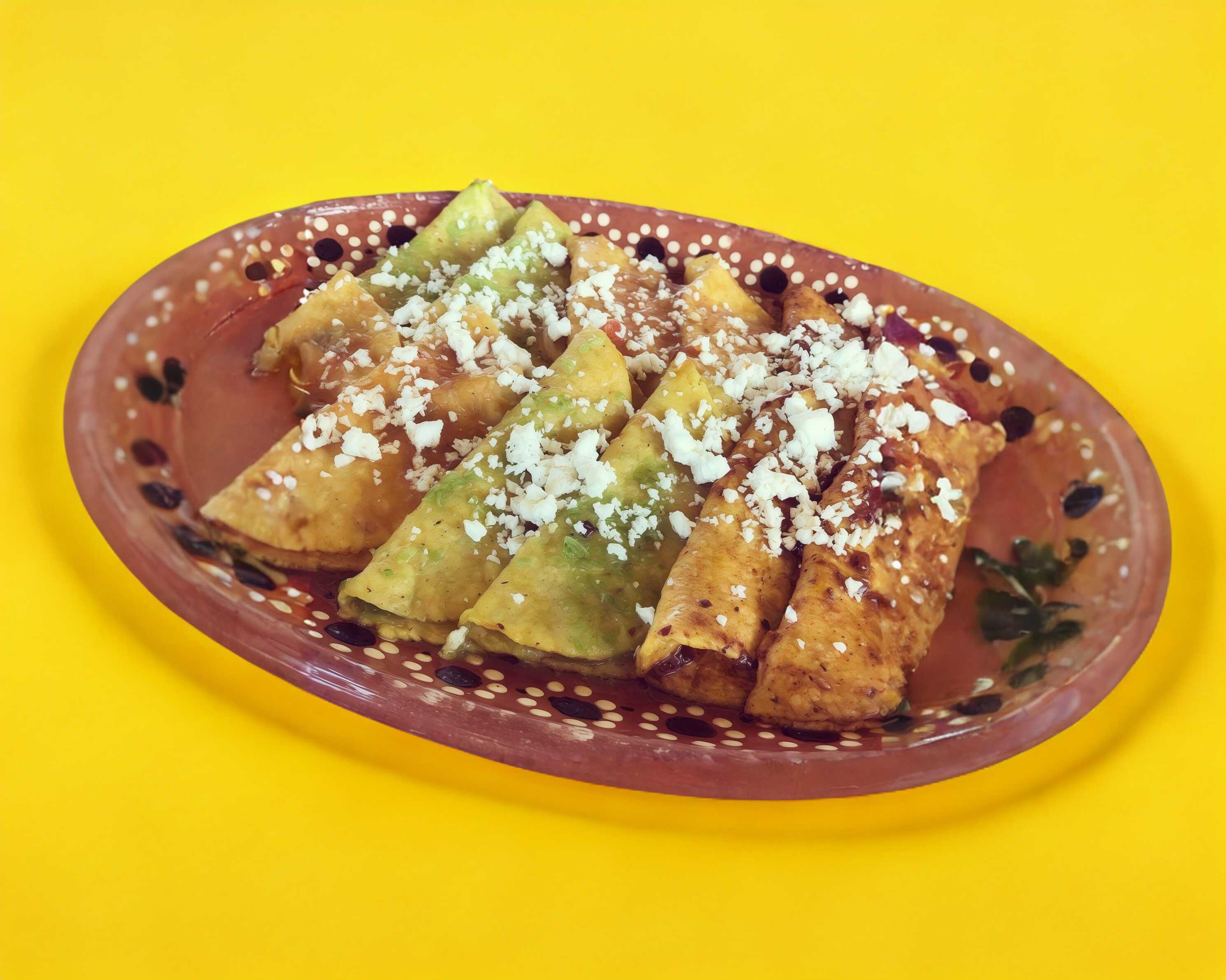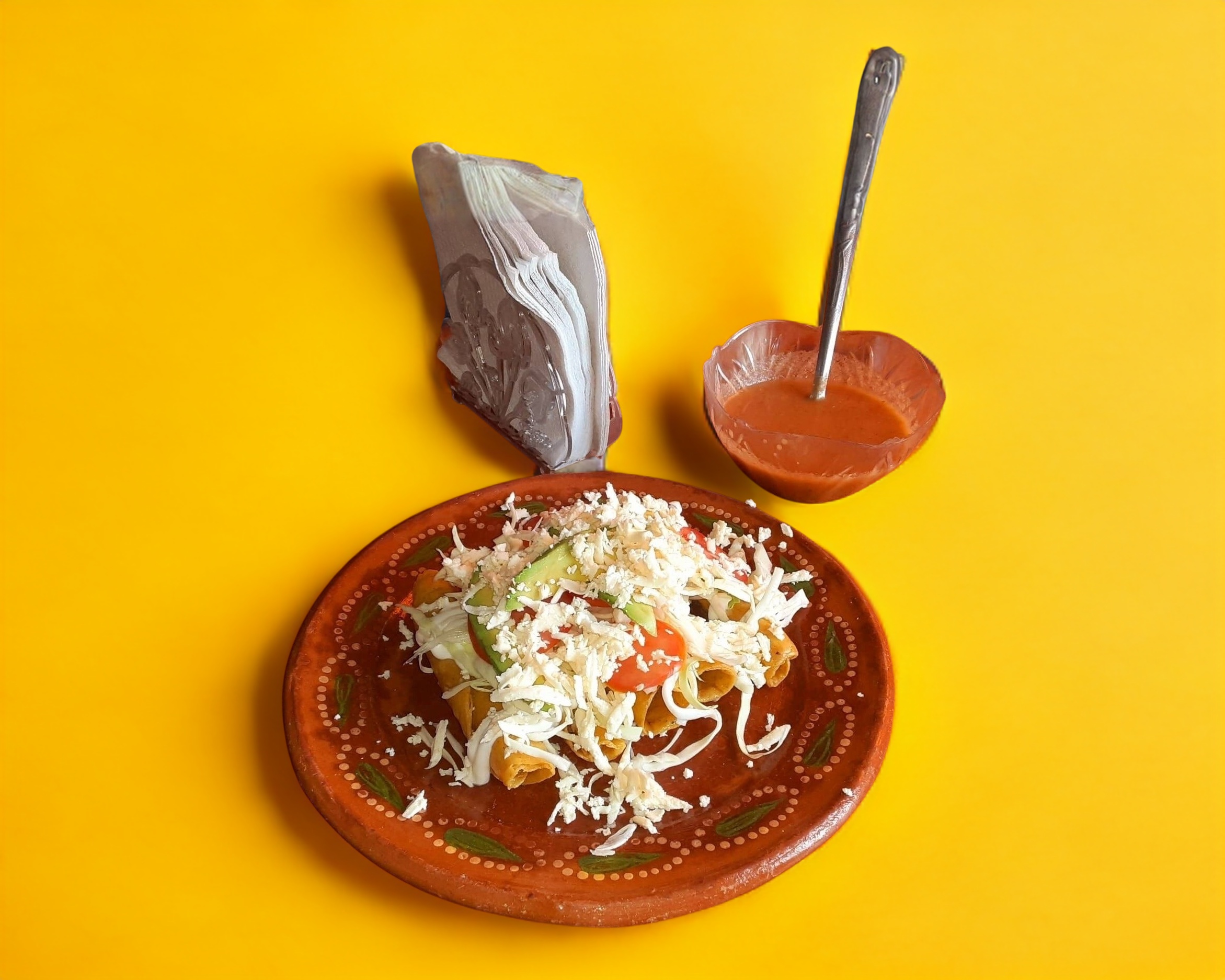 8 piezas de ricas flautas rellenas de pollo acompañadas de una rica ensalada y una rica salsa roja