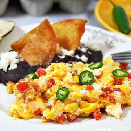 Huevo revuelto con cebolla chile y jitomate acompañado de ricos frijolitos refritos