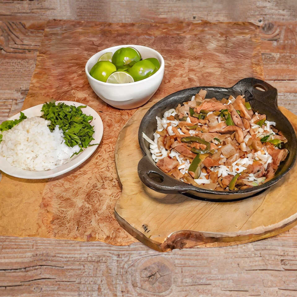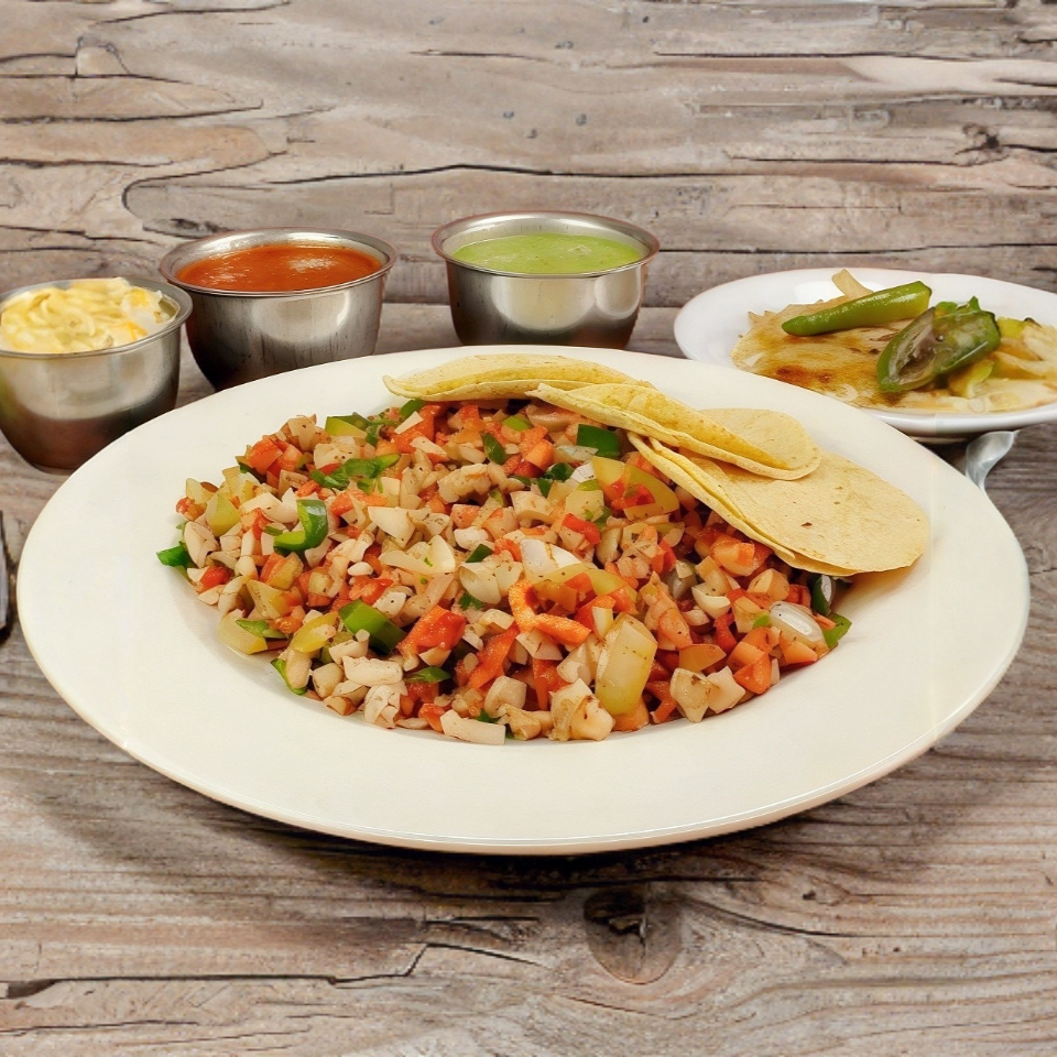 Combinación de bistec de res, tocino, queso, chile poblano y cebolla, acompañado con tortillas de harina y salsas.