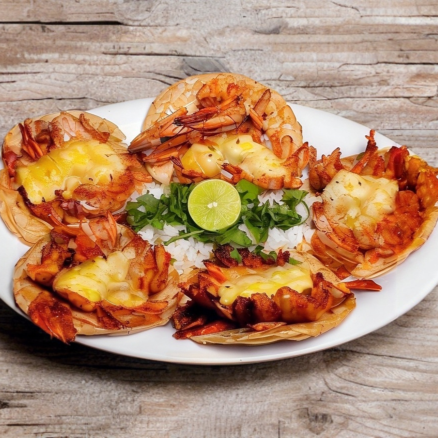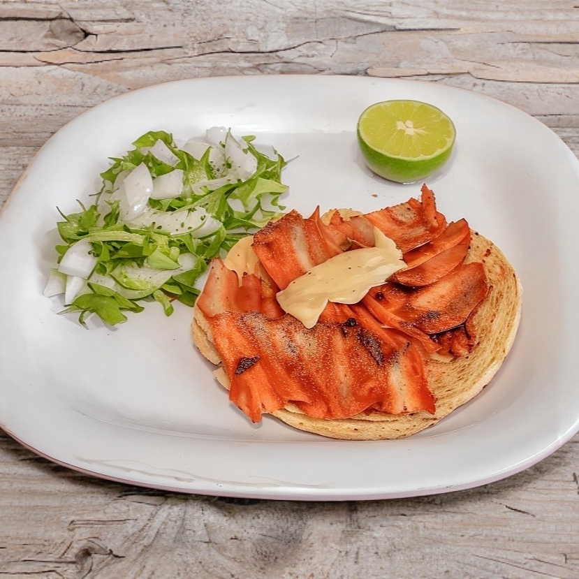 Deliciosa costra de queso, rellena de carne de chuleta natural, presentado sobre tortillas de harina.