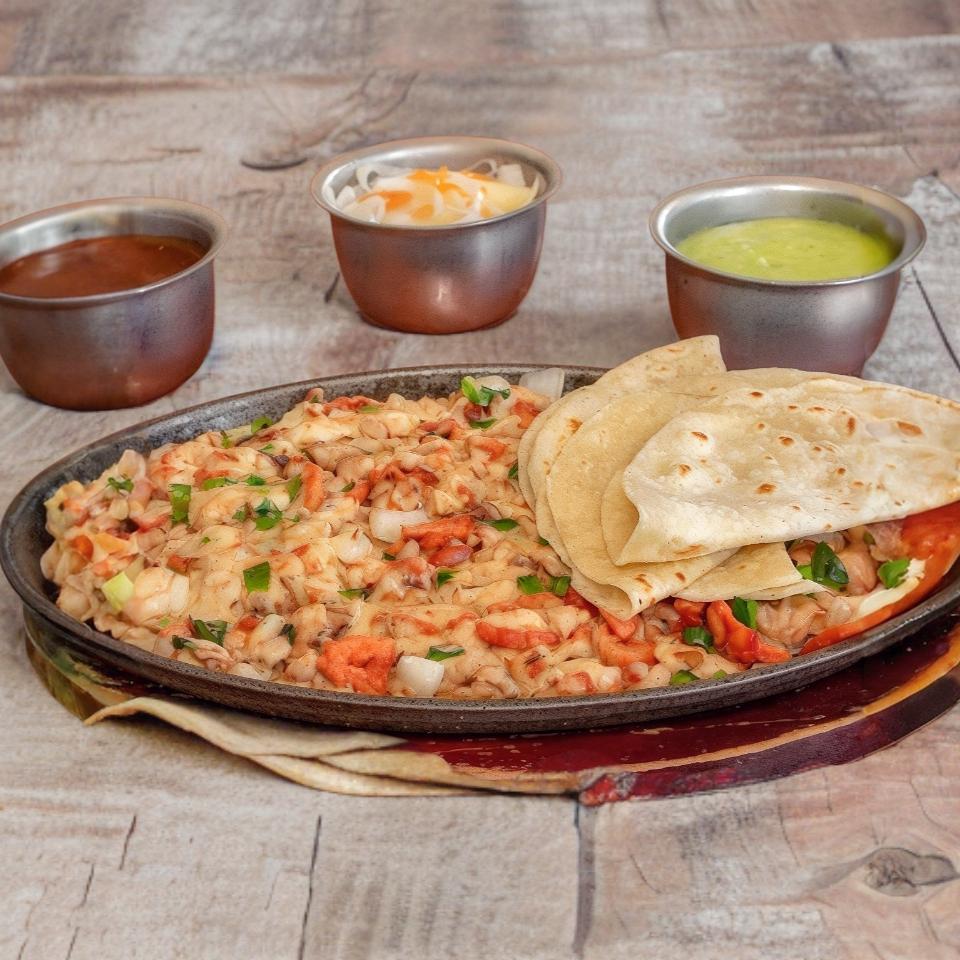 Combinación de pastor, chuleta, tocino, queso, chile poblano y cebolla, acompañado con tortillas de harina y salsas.