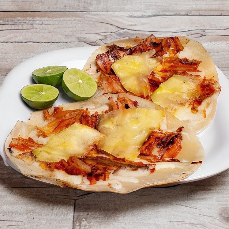 Deliciosa costra de queso, rellena de carne de pastor, presentado sobre tortillas de harina.