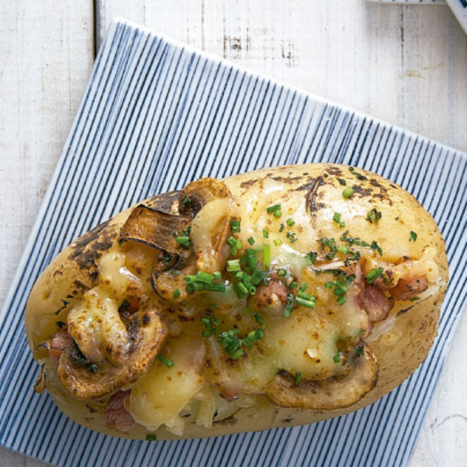 Deliciosa papa asada, acompañada de champiñones y queso.