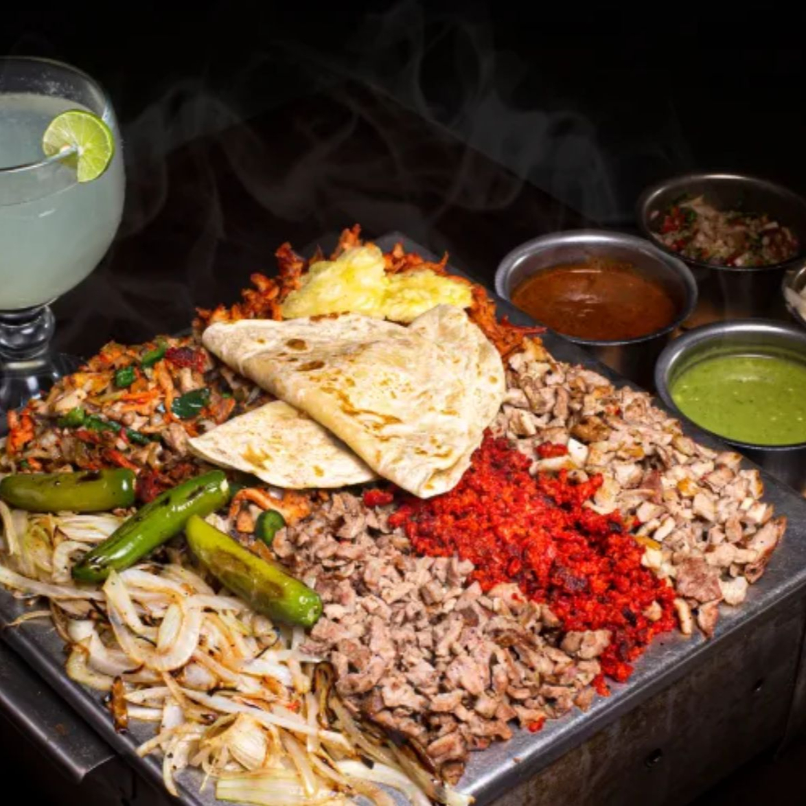 Combinación de arrachera, tocino, queso, chile poblano y cebolla, acompañado con tortillas de harina y salsas.