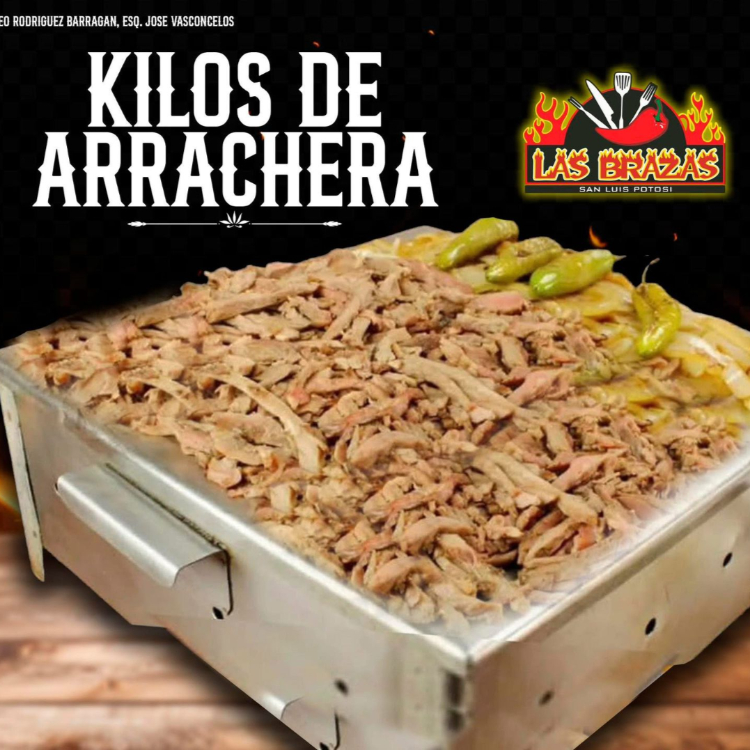 Kilo de carne de arrachera a las brazas, incluye papas a la francesa, ensalada, frijoles charros, cebollitas asadas con chilitos toreados, tortillas de maíz, salsa verde, salsa roja, pico de gallo, cebolla encurtida con habanero y limones.