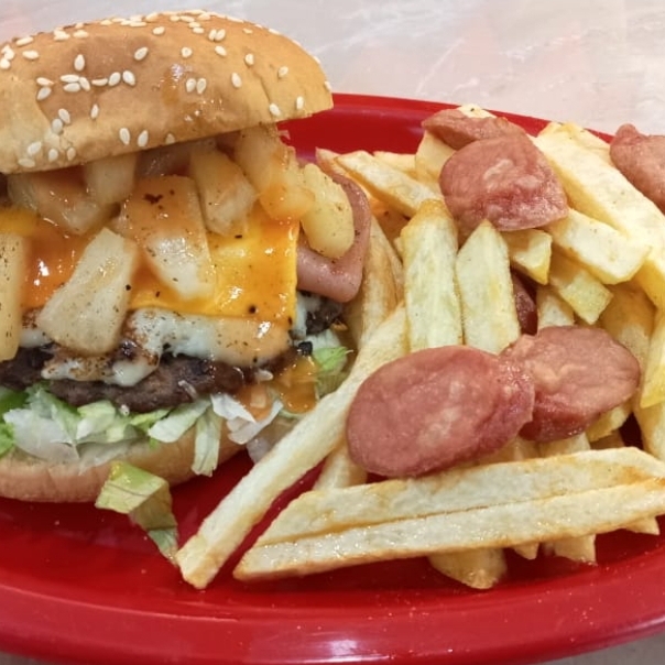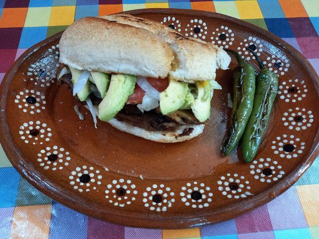 Bolillo, lomo, lechuga, jitomate, cebolla, aguacate, aderezos, salsa