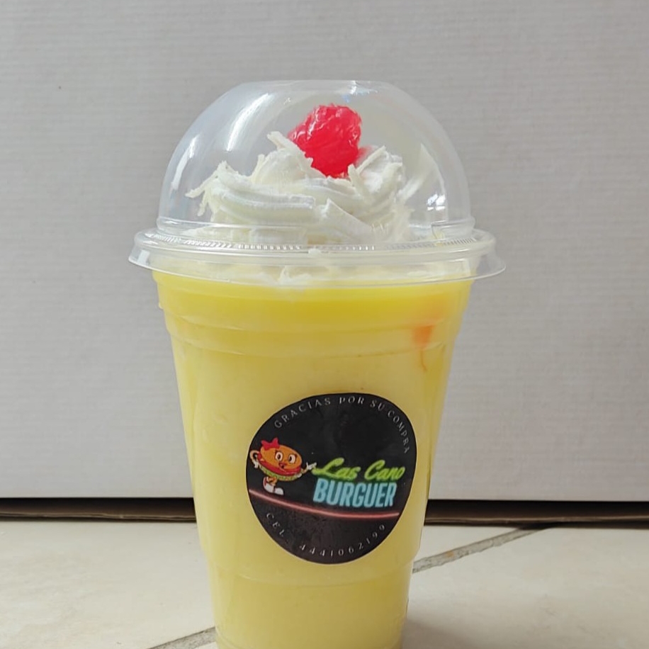 Piña congelada, jugó de piña, crema de coco, azúcar, chantilly cereza para decorar