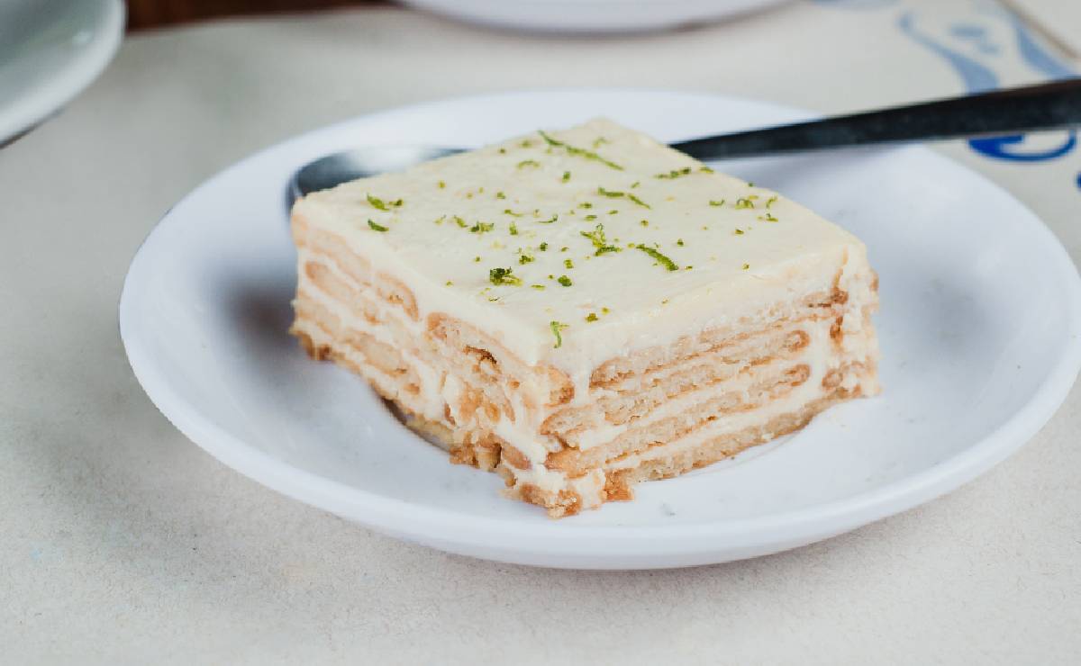 Torta de cochinita con una capa de frijol y cebolla morada.