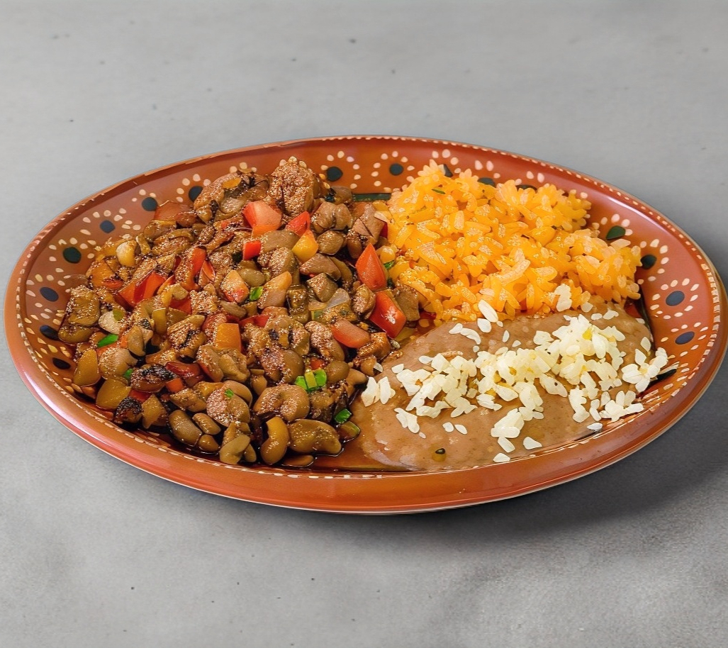 Incluye sopa aguada, bebida a elegir y tortillas hechas a mano, acompañado de arroz y frijoles.