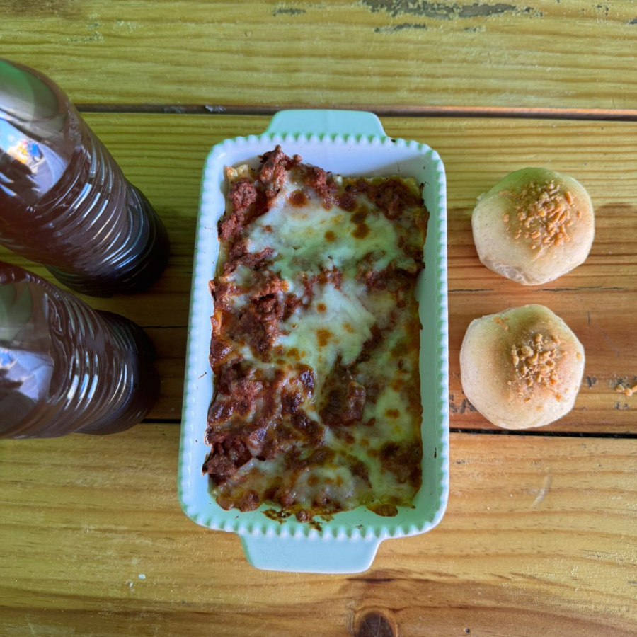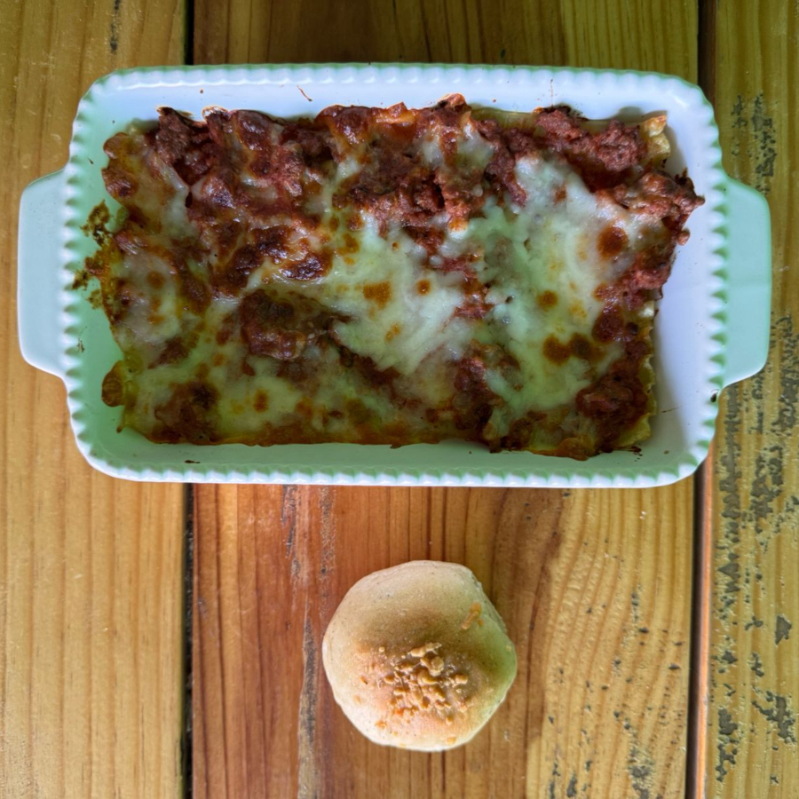 Tradicional lasaña italiana con carne de res a la boloñesa, incluye un pan de ajo. 450g peso.