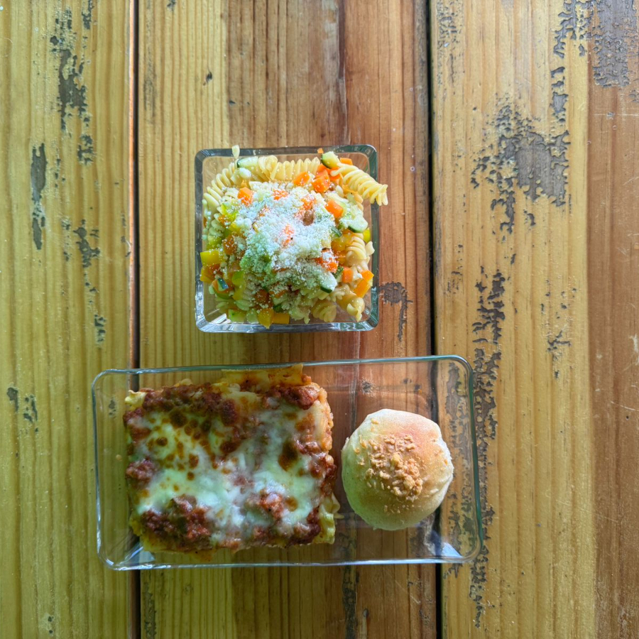Lasañita + ensalada de pasta + pan de ajo.