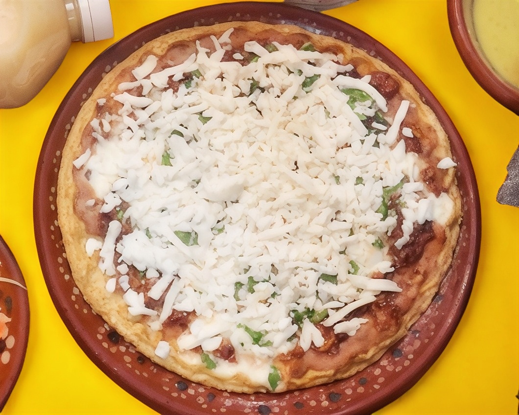 Base de maíz doradita con frijolitos refritos, cebolla, cilantro, crema y queso saltierra.