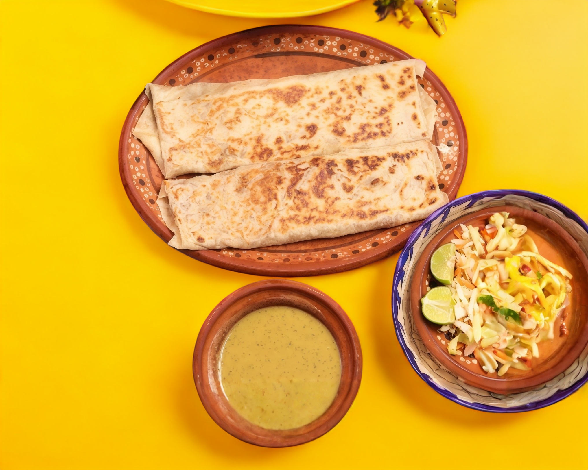 Gorda gigante doradita, con el guisado de tu elección, cebolla cilantro, crema, y quesito fundido.