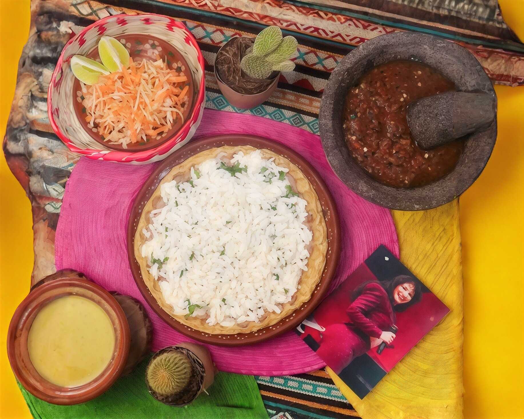 Taquitos de guisado en tortilla de maíz, hecha a mano con arroz y el guisado de tu elección