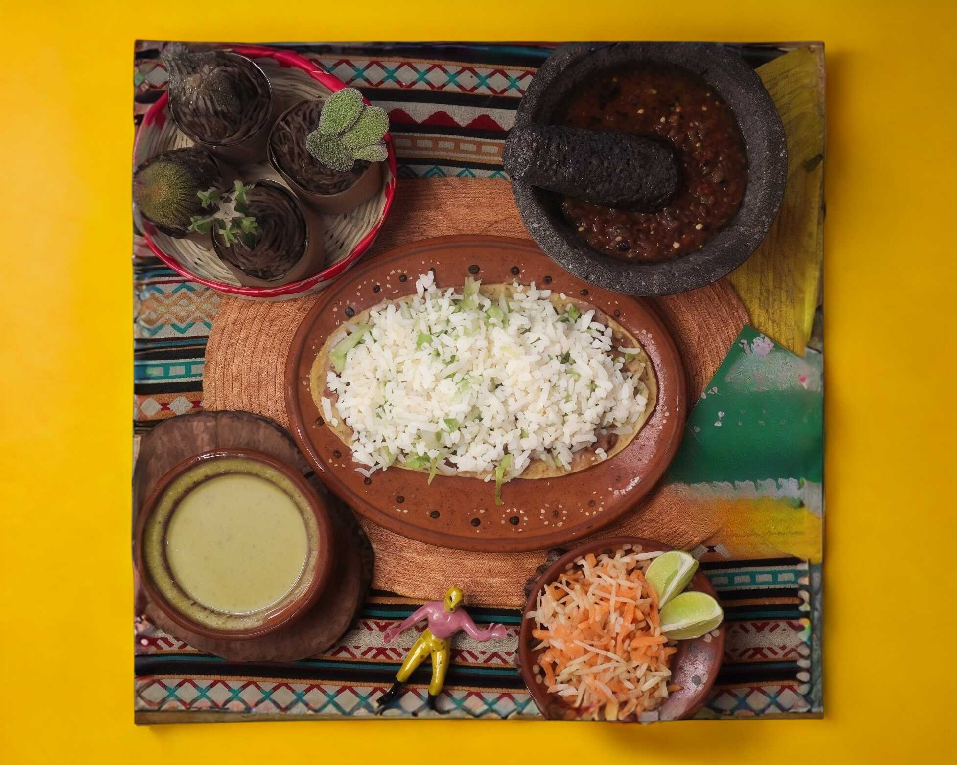 Base de maíz doradita con frijolitos refritos, cebolla, cilantro, crema y queso saltierra y el guisado de tu elección.