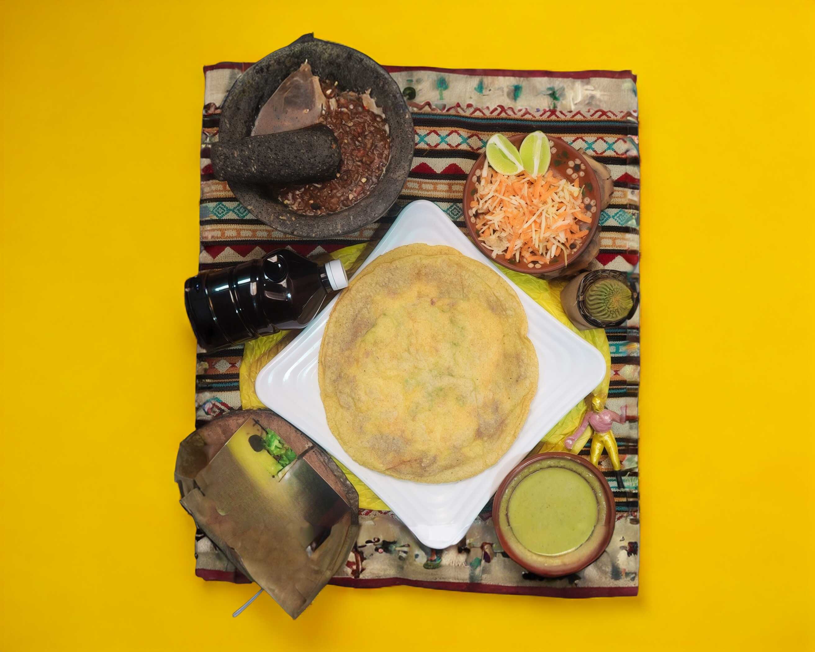 Base de maíz doradita con frijolitos refritos, lechuga, crema, queso saltierra y el guisado de tu elección.