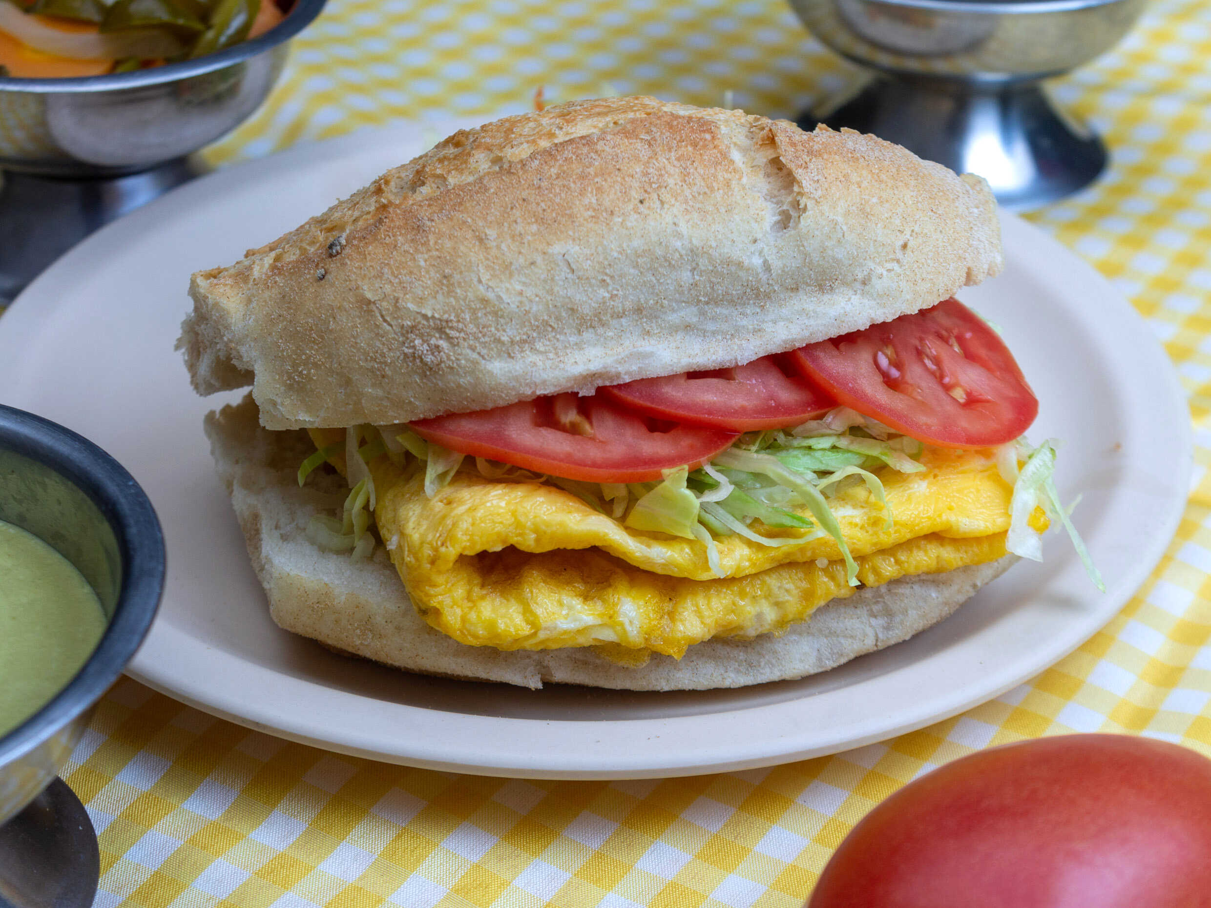 Aguacate, lechuga, tomate, cebolla, chiles en vinagre, mantequilla, mostaza y mayonesa.