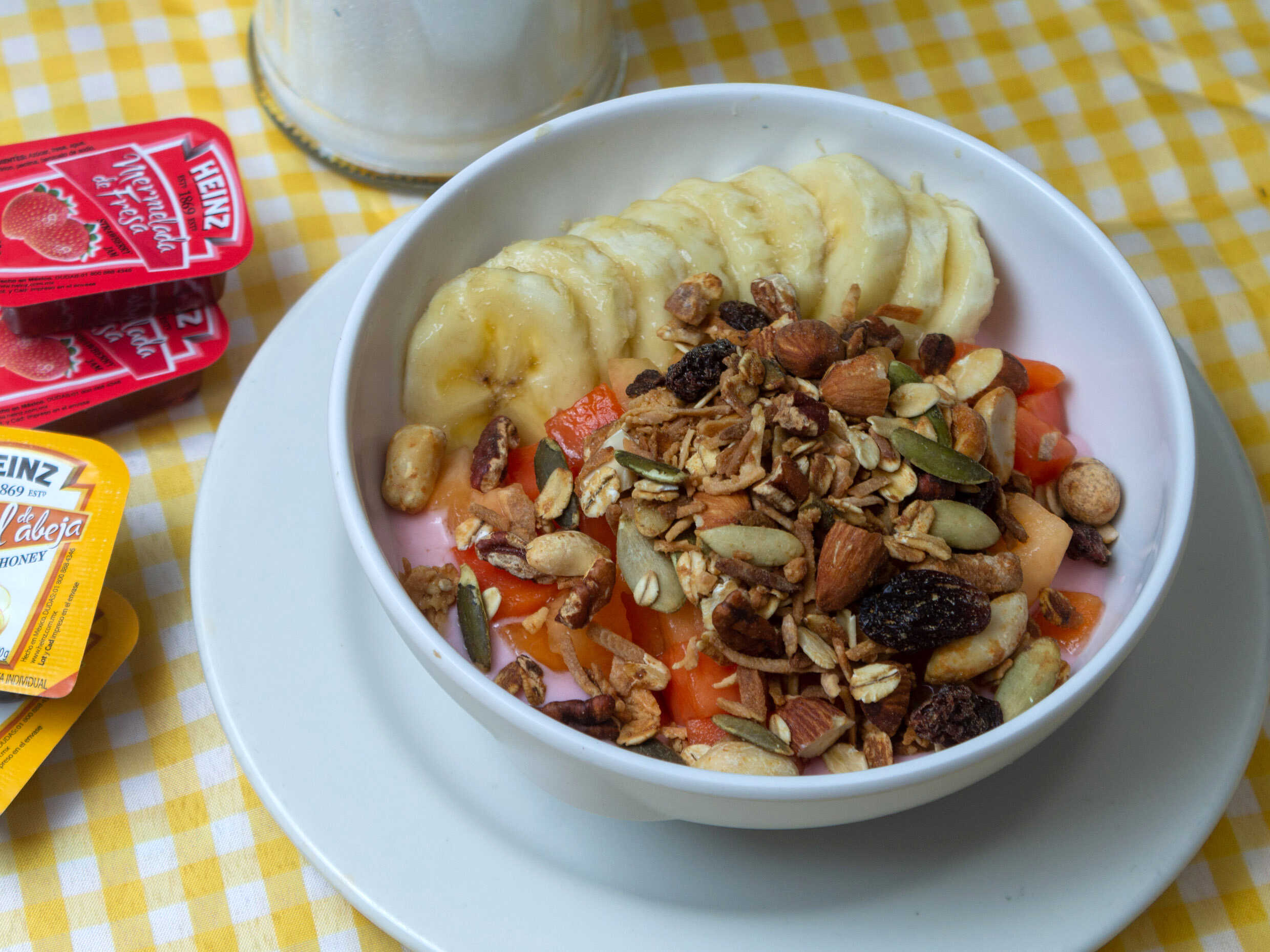 Tazón con melón, sandía, papaya, piña y plátano, yogurt de fresa y granola.