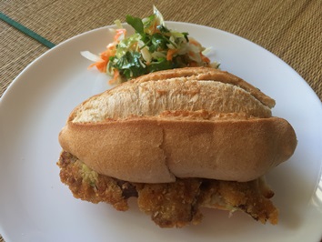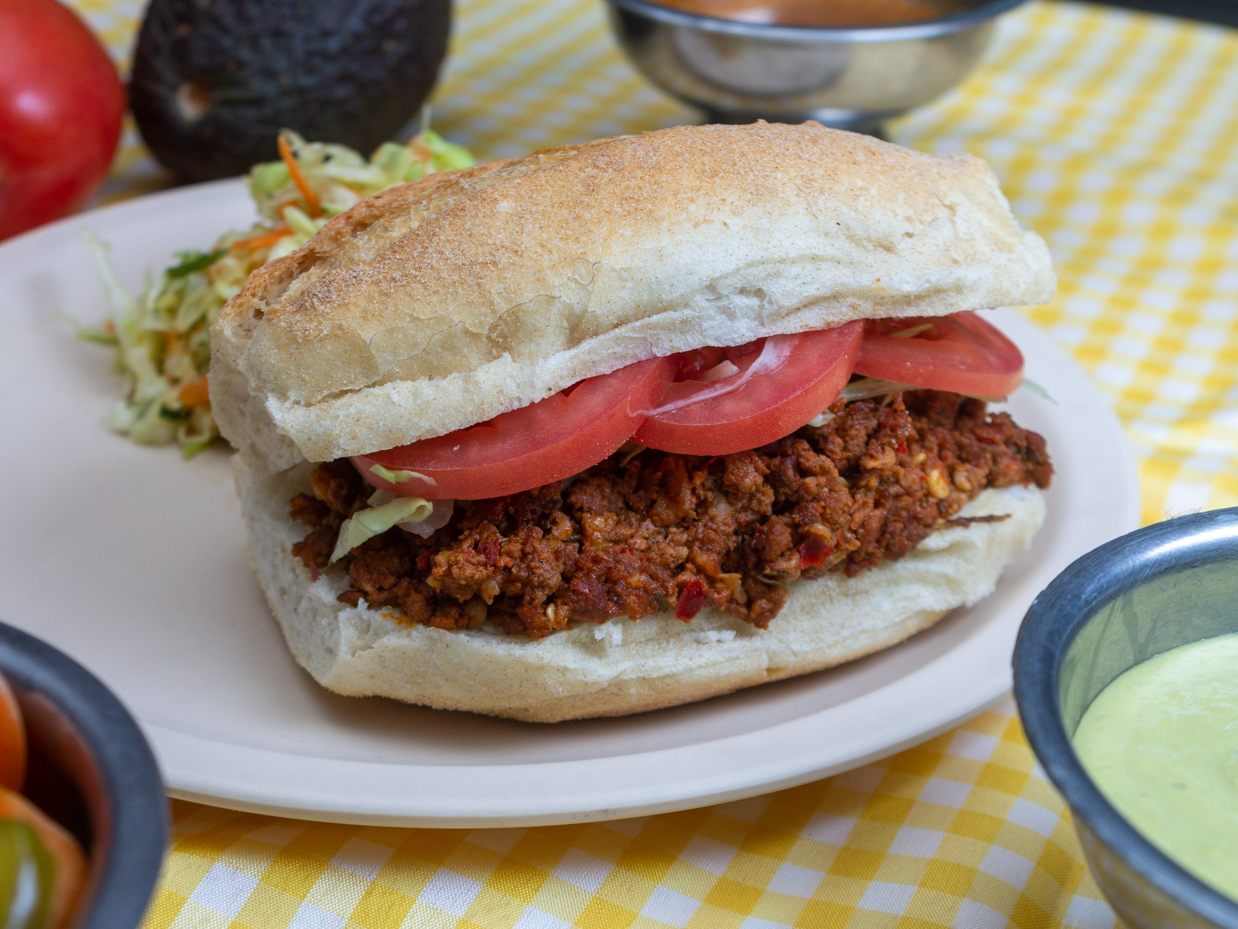 Doradita pechuga empanizada servida con queso amarillo, lechuga, tomate, cebolla, chiles en vinagre, mantequilla, mostaza y mayonesa. Acompañada de papas a la francesa y ensalada de col.