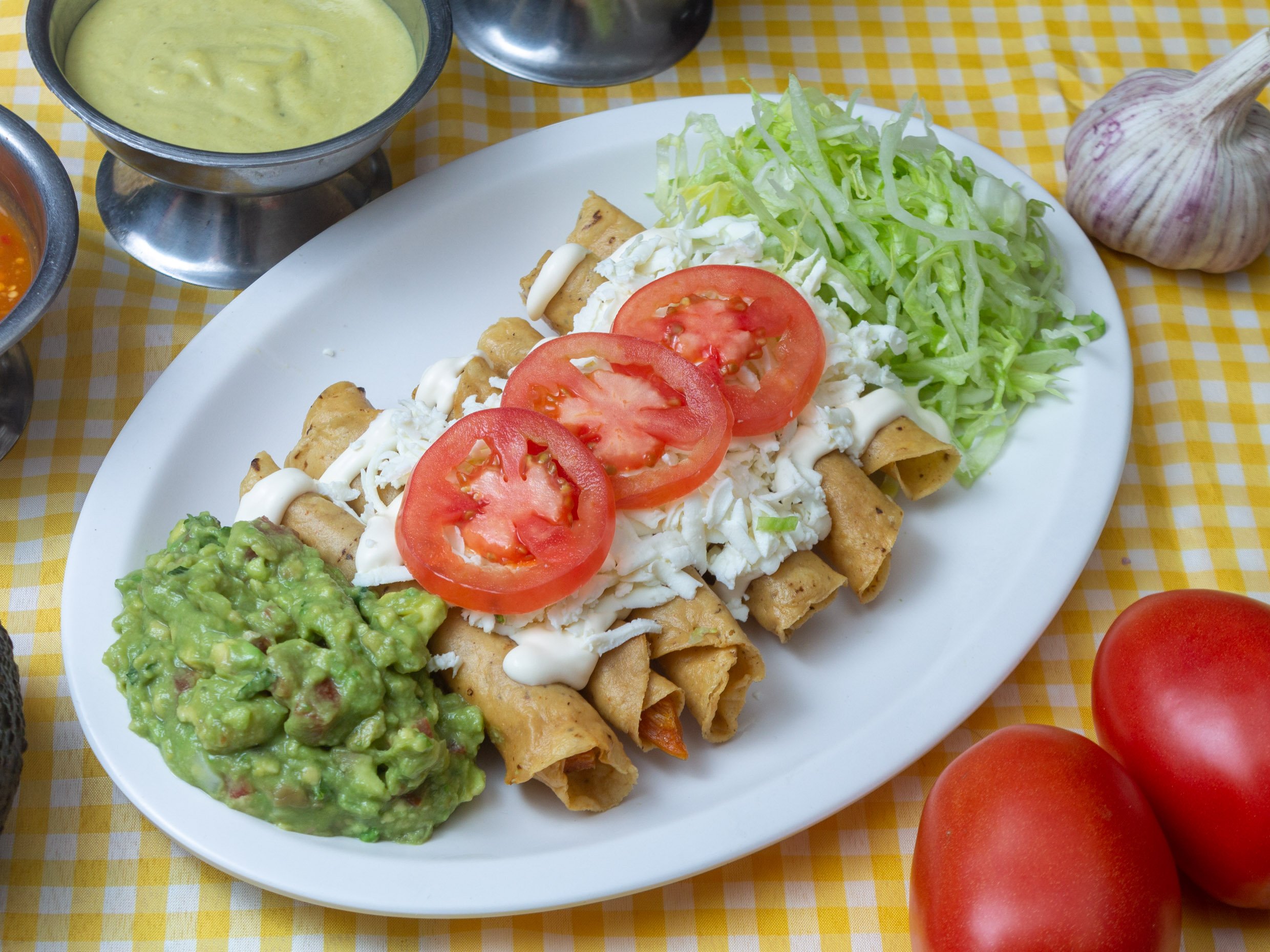 Hechas en casa, servida con guacamole, frijoles refritos, crema y cebolla.