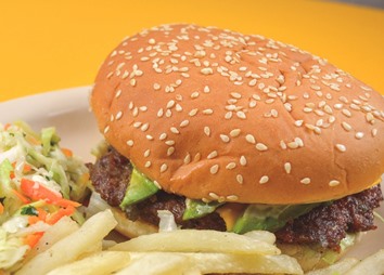 Jugosa hamburguesa de res con queso amarillo, lechuga, tomate, cebolla, chiles en vinagre, mantequilla, mostaza y mayonesa. Acompañada de papas a la francesa y ensalada de col.