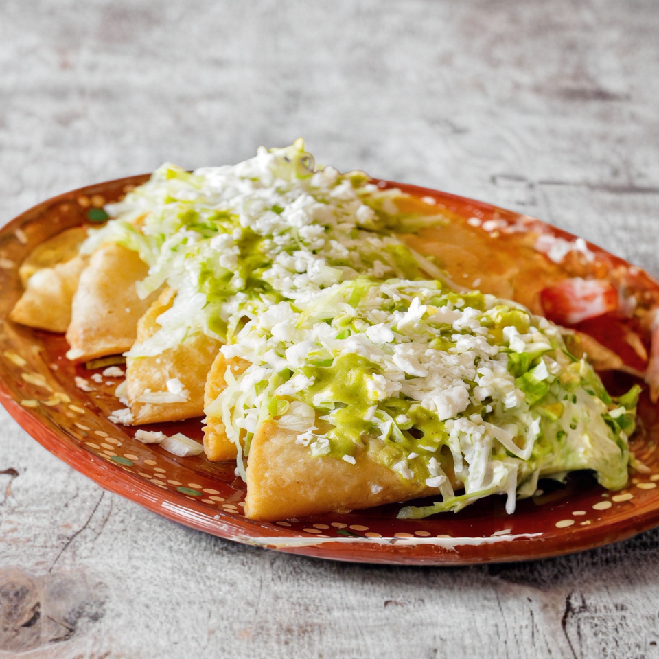 5 Piezas. Rellenas de pollo, bañadas en salsa de tomate, aguacate, cebolla y porción de frijoles.