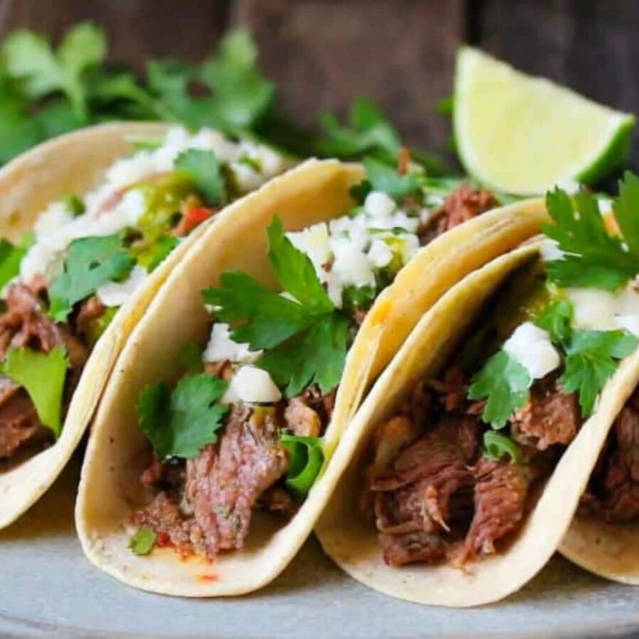 Tortilla doble, barbacoa, acompañada de salsa, limones, cilantro y cebolla.