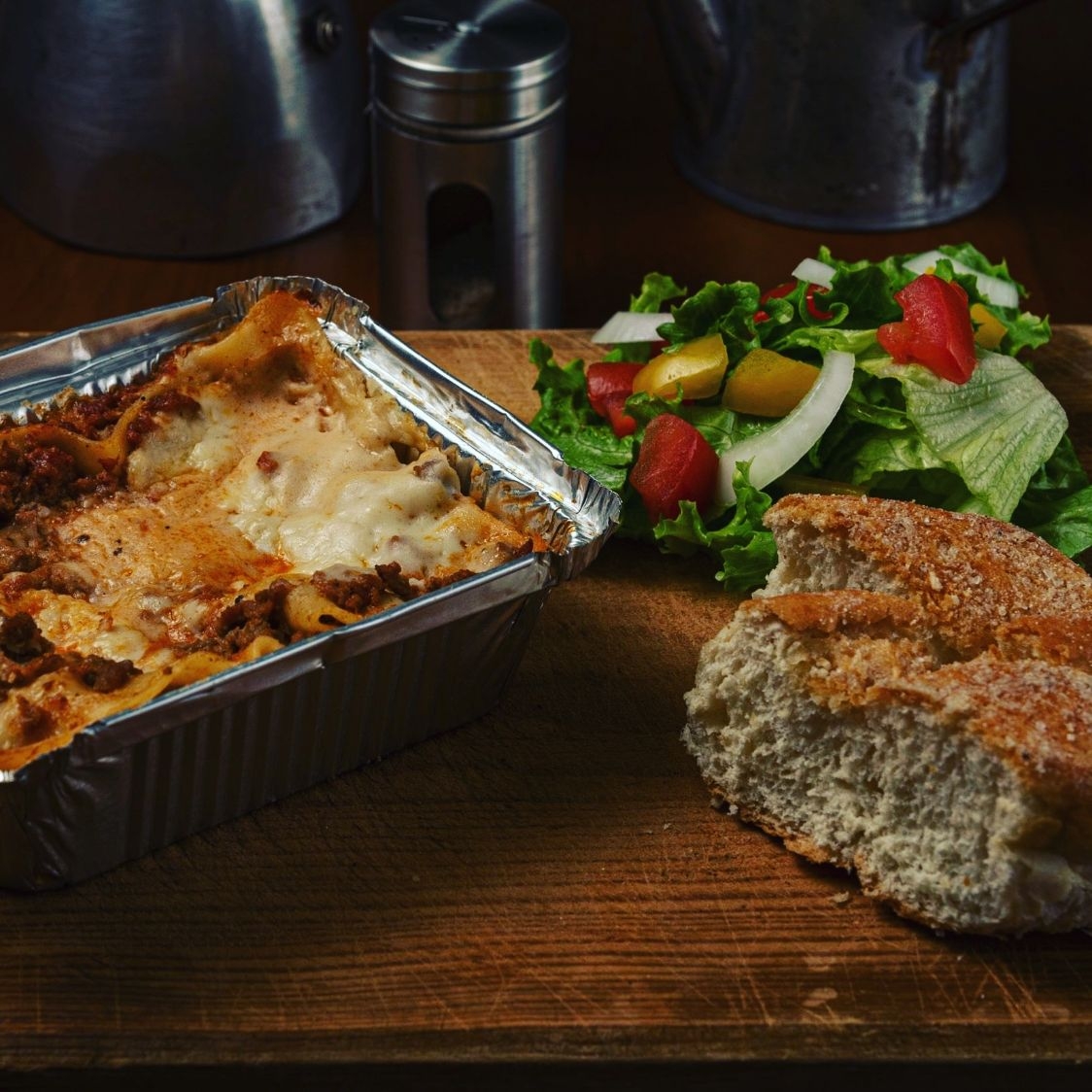 1 lasagna individual de carne de res, con 1 ensalada, y 1 pan de ajo, ideal para una persona