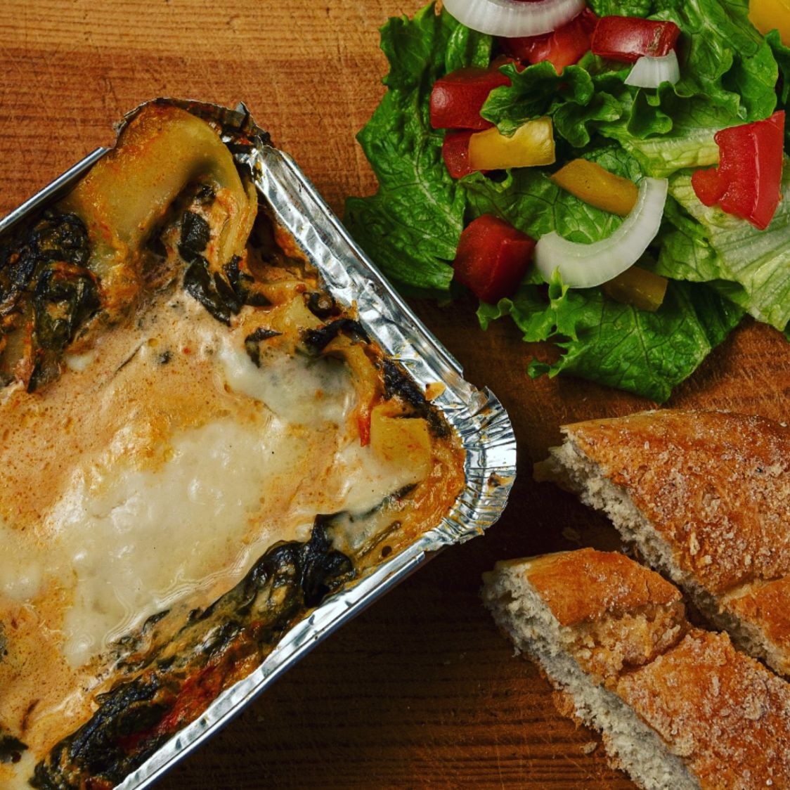 1 lasagna individual de espinacas (jitomate, cebolla, espinacas, bechamel y queso parmesano). 1 ensalada y 1 pan de ajo. Ideal para una persona