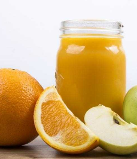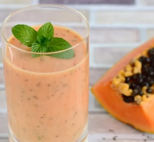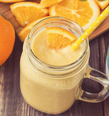 Delicioso licuado de naranja con frutas variadas y cereales.