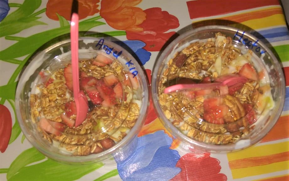 Delicioso yogurth con fruta de temporada, miel y granola.