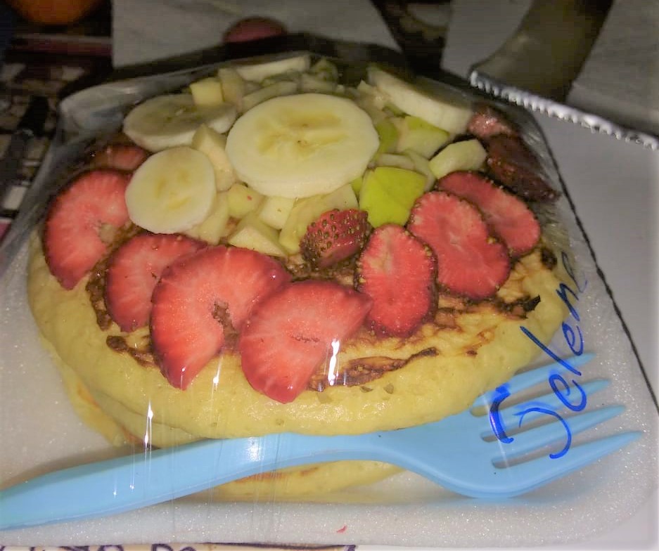 3 Deliciosos hot cakes, acompañados de comlemento a elegri máx 1 (lechera, mermelada de fresa), además de la fruta a escoger máx 1 plátano, fresa.